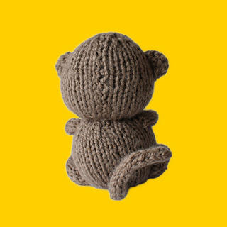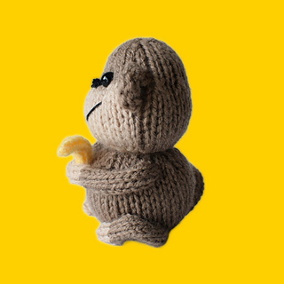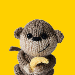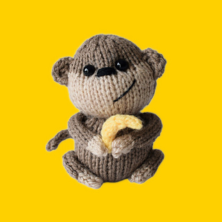 Micky the Monkey is having a banana snack! This is a pocket-sized toy you can carry with you on your adventures. Worked mostly in stockinette with increases and decreases for shaping, the face incorporates intarsia colour-work.