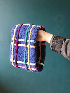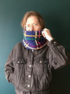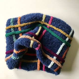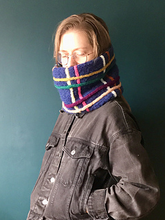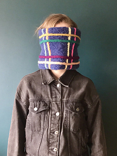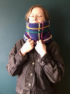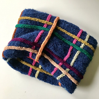 Midnight Milkshake cowl is worked sideways, in the round creating a double fabric, in stockinette stitch with scrap yarn i-cords creating vertical stripes. To make up the plaid pattern, horizontal scrap yarn stripes are purled in set intervals. The cowl is closed with a ”pick up as you go” scrap yarn I-cord.