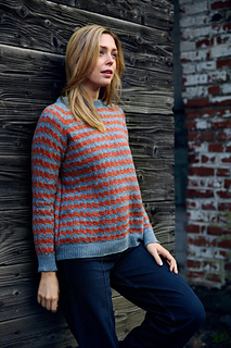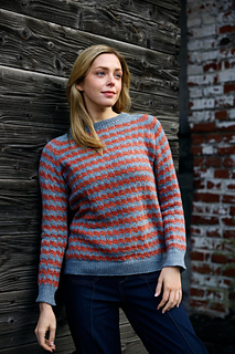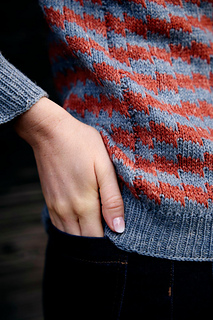 The sweater is knitted from the top down, and its motif is created using mosaic knitting with slipped stitches. This raglan-sleeved sweater is worked seamlessly from the top down. The resulting fabric is warm and dense. The interesting and surprisingly easy pattern looks like stranded colorwork, but only one color is worked at a time.