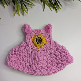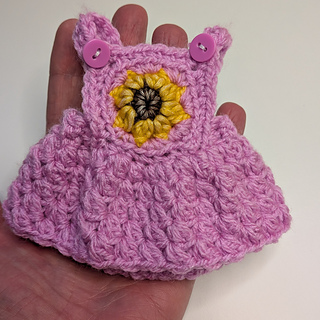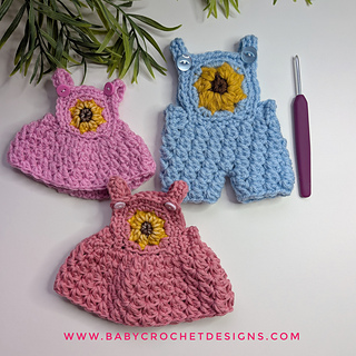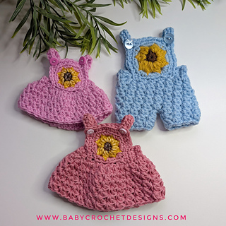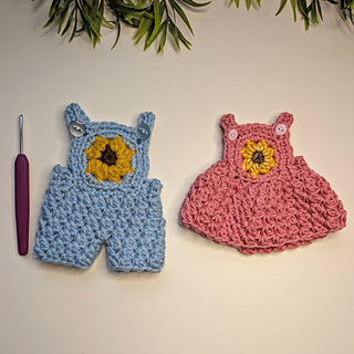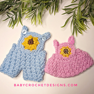 This is a miniature version of the sunflower overalls and dress pattern that can be used for gender reveals, keepsakes or dolls.