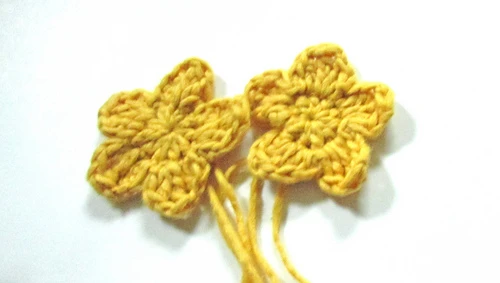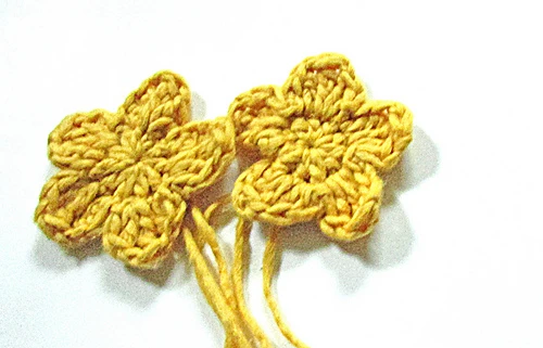Shown in a Knit Picks SnugglePuff, an aran-weight cotton blend, the Miriam Makeba double petal flower is 2.75 inches/7 cm, the flat flower is 2.5 inches/6cm.