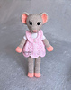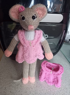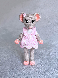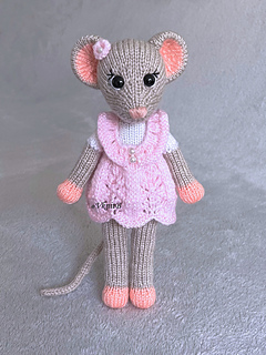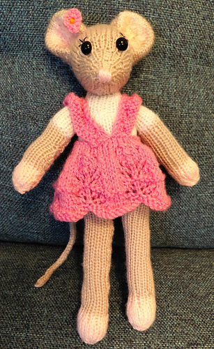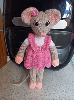 This is a knitting pattern for a stuffed toy mouse called Miss M. The toy and the dress are knitted on 2 needles. The body and legs are worked in one piece.
