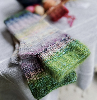 I have been making these Mittz for many years, and have shared it with family and friends, and I hope you will also find them a great project to make, gift, and to have. Mittz are made using sock/fingering weight yarn held double on size 4/3.5mm double pointed needles (or a 40” circular if knitting magic loop). The top of the mitt is knit with two strands of lace weight mohair held together with one strand of your sock/fingering yarn. If using Mechita from Malabrigo, you will have enough to make two pairs! There are photos included of stash busting options; reach out if you want to know the yarns used or general guidance on how to blend your shades to get a nice fade effect.