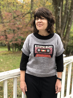 Time to pump up the volume on your handknit wardrobe! This homage to the mixtape is a fun, retro design that uses the intarsia technique. this lightweight tee is knit in only 2 pieces (front and back) and then seamed together. There is even a light colored band at the top of the tape motif that is perfect for labeling (aka ‘embroidering’) the name of your creation!