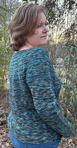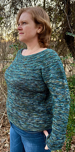 This top-down, round-neck pullover features a simple textured and eyelet design on the yoke that lets the colorway take center stage. It was designed and knit in the booth while I was away for a show with Chaos Fiber Company; that tells you how simple it is to knit!