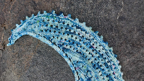 This design is knit top down in a crescent-shaped silhouette with simple eyelets and a pretty picot edge for textural effect.