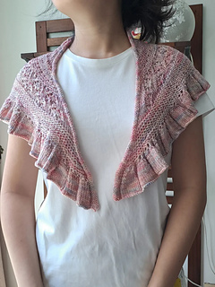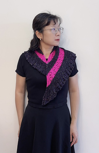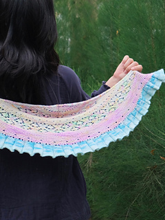 The larger shawl can be worn with the straight edge along the shoulders or reversed so the frilled edge frames the neckline. Both options drape beautifully. The mini version features a button closure that can be fastened through any yarn-over hole, offering multiple styling possibilities. Enjoy experimenting with different ways to wear and showcase your Moonlake!