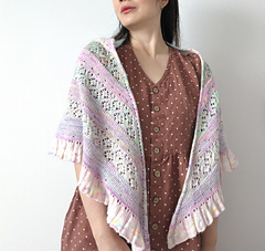 A crescent-shaped shawl adorned with floral lace and soft frills,