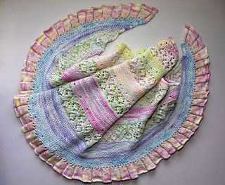 Larger shawl worked with 12 colourways (one for each “moon”).