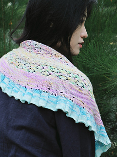 Moonlake is a crescent-shaped shawl inspired by ancient Chinese mythology where the lunar goddess gave birth to twelve moons and bathed them in celestial waters. The design combines floral lace with garter stitch sections, and finishes with a rippling edge, creating rhythm and textures throughout the piece. Worked from the top down, the shawl begins with a stockinette tab cast-on and uses short rows and increases to form its curved shape.