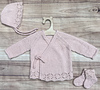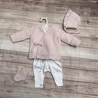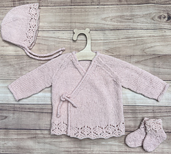 If only we could keep them little just a tiny bit longer. Morning Star captures those fleeting baby days in timeless style — a wrap cardigan with a delicate lace hem and an easy tie front, paired with a matching bonnet and socks. Soft, sweet, and made for life’s earliest memories.