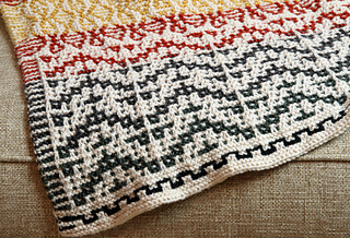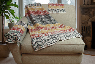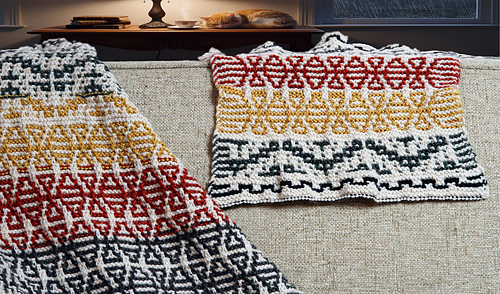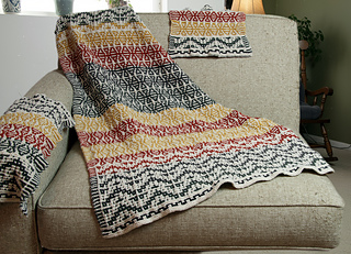 This mosaic chair set includes covers for two armrests, the headrest, and a footstool. It’s super easy to customize with different colors to match your decor! It’s a fun and simple knit, perfect for adding some pop to your space.