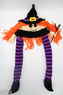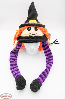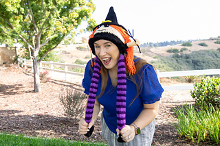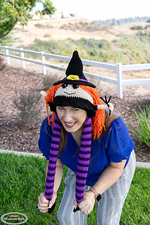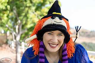 Create a one-of-a-kind crochet witch hat with this fun pattern. The playful design features a witch face, pointy hat, dangling striped legs, and a magical pump system that makes her arms move when you squeeze them!