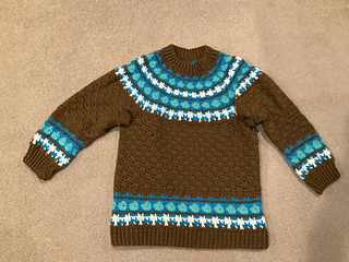 Natalie is a classic circular yoke pullover with mosaic yoke and textured body/sleeves with optional mosaics on cuffs and bottom.
