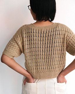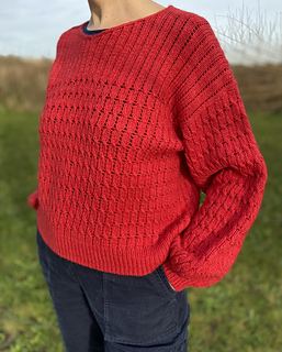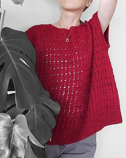 The back piece is worked first from the top, beginning with ribbing across the shoulders, and knitted flat to the bottom of the armhole. Stitches on the cast-on row on the back are divided for shoulders and neck. Each shoulder is picked up from the cast-on row and worked in short rows and with neck shaping towards the front. After the front pieces are joined, the front is worked flat to the bottom of the armhole. The front and back are joined to be continued in the round to the hem. Stitches are picked up around the armholes. For the vest version, armholes are finished in 1x1 ribbing. For the long sleeves version, sleeves are worked in the round to the cuffs.