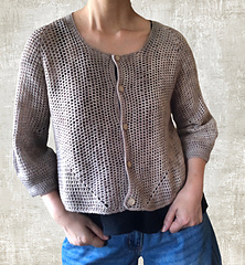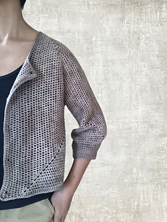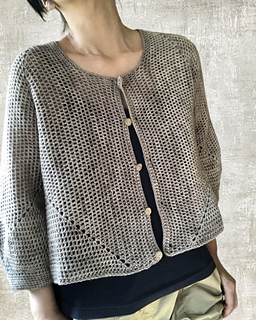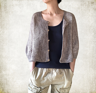 The cardigan is constructed from two hexagons worked in the round. After shaping the sleeves, the center back is worked flat. The hexagons are then seamed to form the body and sleeves.