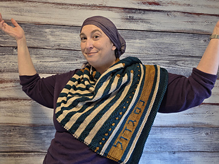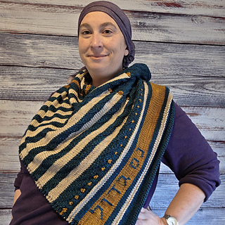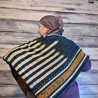 shawl with charted options for a dreidel, “Nes Gadol Haya Sham,” “Nes Gadol Haya Po,” or simply “Nes Gadol.”