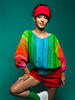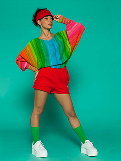 Der nahtlos quergestrickte Pulli zeigt die bunte Farbpalette der Stärke 6 Brüder. Bündchen und Ärmel werden rundgestrickt, der Körper in Reihen um später wieder in Runden überzugehen.
