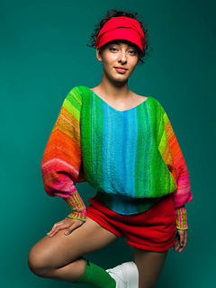This sideways-knit sweater seamlessly showcases the Stärke 6 Brüder’s colorful palette. The cuff and sleeve are knitted in the round, while the body is knitted in rows. Then, it transitions back to rounds for the second sleeve and cuff.