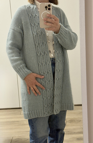 The three pieces are then joined, the armholes are shaped and the cardigan is knit to the desired length, continuing with the increases along the neckline opening. At this point a rib stitch border is added.