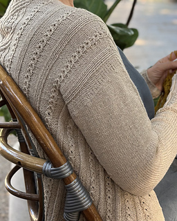 The sleeves are also worked top down, in the round, after picking up stitches from the body edges and working a short row sleeve cap. The sleeves end in a long cuff that mirrors the main body pattern.