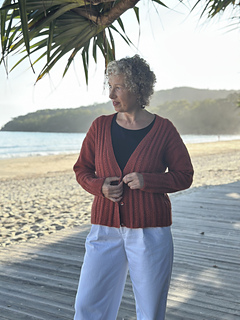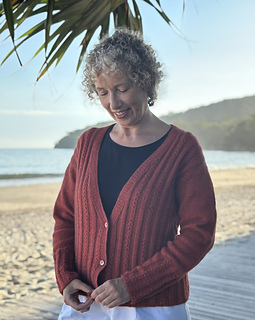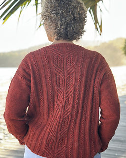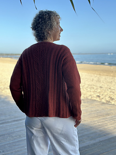 The Noosa cardigan is worked flat in one piece top down, starting with the back. The beautiful cabled spine is worked in the centre of the piece with short rows used for the shoulder shaping. The back piece is worked to the underarms, then front pieces are picked up from the shoulder edges. After joining the fronts and the back, the rest of the body is done in one piece, starting from the underarms.