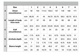 1 (2, 3, 4, 5)(6, 7, 8) finished chest circumference between 92cm/36.25” and 171cm/67.25”.