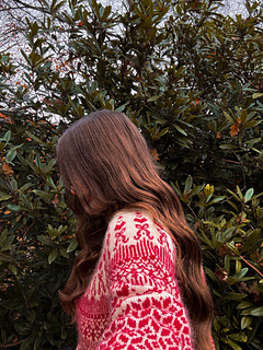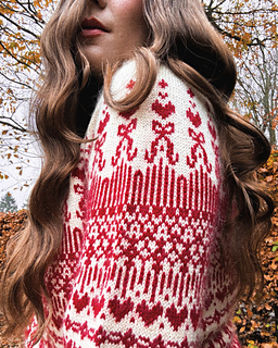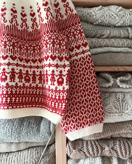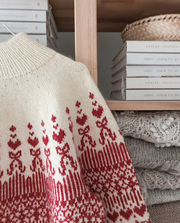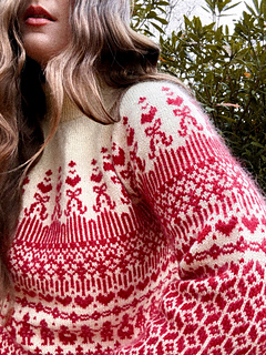 Method: The sweater is knitted top-down in the round in Stockinette Stitch. All edges of the sweater are knitted in rib, and the neckline is double layered. When knitting the round yoke, body and sleeves, a series of charts is followed to create the multicolored pattern.