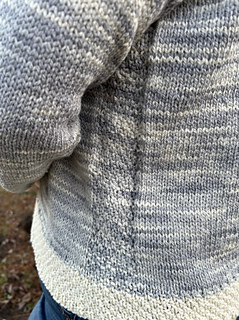 Yarn: Winterstrom Ranch Fiber Mill Rambouillet/Silk, 200 yards/68g skein; they call it “approximately Sport” (but DK will work for this). Your yardage will vary according to size and length chosen. Smallest size will use about 800 yards; largest about 1600. My 44” bust, 16” long sample took 392g, roughly 1150 yards – about 150g of this was the contrasting color. Make sure to buy adequate amounts; I like to have an extra skein just in case.