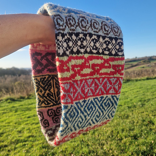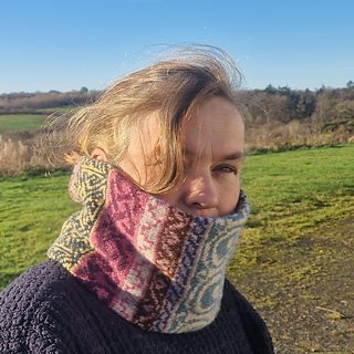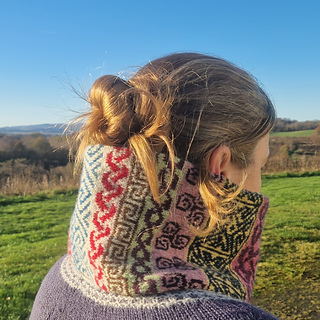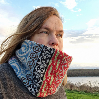This cowl is a very simple construction, you cast on and knit in the round, repeating the motifs with whatever colours and placement you want until it is the length you want, then graft the ends together. The exact colours and order of the sample has been used which will give you a close-fitting single loop cowl. If you repeat the motifs you can make a longer cowl and the colour placement is entirely up to you.