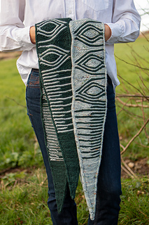 There are two versions of the scarf shown, with the colours mirrored in the second scarf. To maximise the yarn available one scarf has an extra repeat of the central motif, creating a slightly longer length.