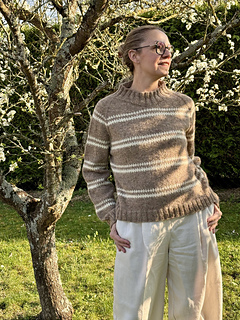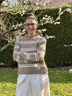 Oisans is a comfortable raglan sweater with a mock collar. This sweater is worked seamlessly from the top down and features stripes in a simple Fair Isle pattern. Construction begins with the collar. Short rows shape the rounded neckline. After knitting the yoke and separating the sleeves, the body is worked from the armholes in one piece. The sleeves are then picked up and knit in the round to the cuffs.