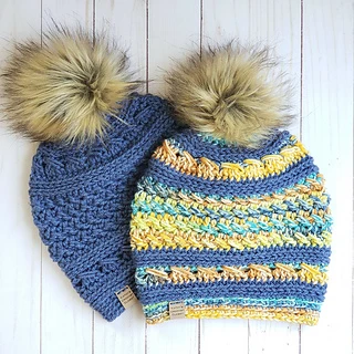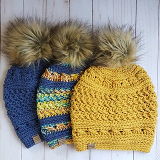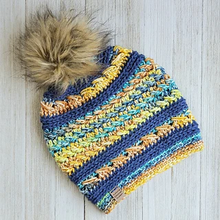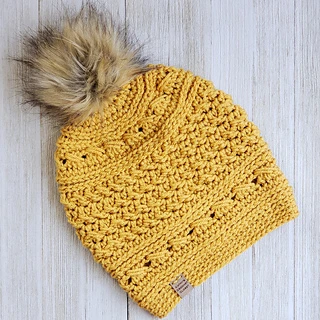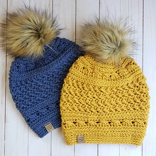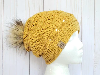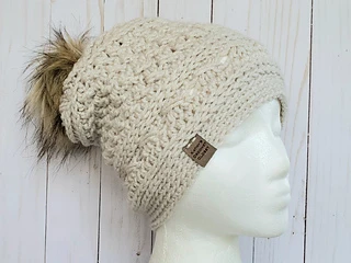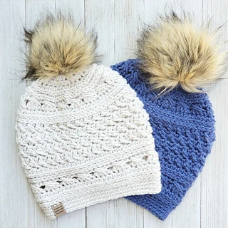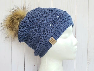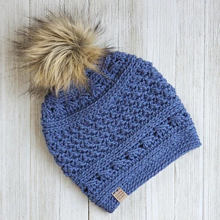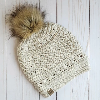 The Olympia Beanie is crocheted using worsted weight yarn and a size J crochet hook. The hat is made from the top down and features a center panel made with post stitches and narrow panels of crossed stitches on the top and bottom. An easy brim and faux fur pompom finish off the cozy hat. The finished hat measures 9.5” from top to bottom and fits an average size head.