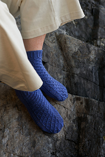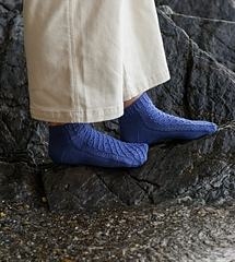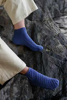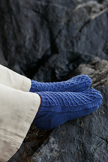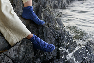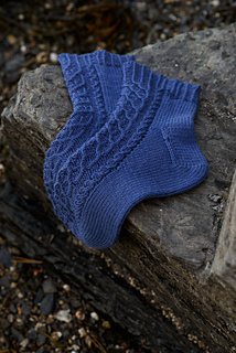 Onde socks are worked toe up with a heel flap. The Onde pattern covers the instep and front leg. Instructions for mirrored socks are included. German short rows are used to create the heel turn. Tubular BO finishes the cuff. The instructions are written for the Magic Loop method.