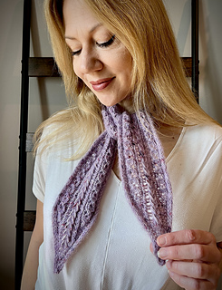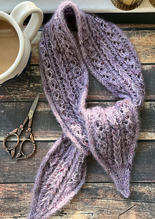 YARN: Scarf sample knit in Woolen Boon Boon Skinny, 100% Merino, 400 yd/3.5 oz (366 m/100 g) in Thistle held together with Amano Yarns Uma, 37% Suri alpaca, 37% mohair, 26% silk, 230 yd/1 oz (210 m/25 g) in Forbidden City; sample used 150 yd/137 m Boon Skinny plus 120 yd/110 m Uma