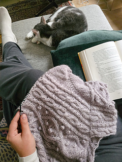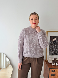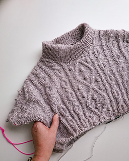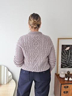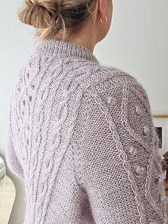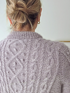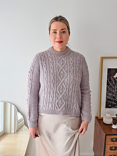The cable pattern combines elegant diamond motifs with rhythmic twists that quickly become intuitive to knit. Although the texture looks intricate, the repeats are easy to memorize and there are calm sections of simple knit and purl stitches in between. Small bobbles add depth and character, but they can be omitted for a cleaner expression.