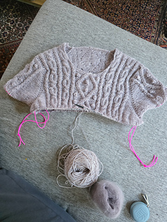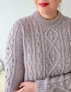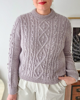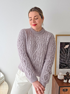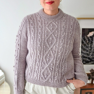 It has a classic silhouette with a beautifully shaped shoulder that almost resembles a set-in sleeve, yet it is worked seamlessly from the top down. The construction allows you to try it on as you knit and adjust the length of both body and sleeves to suit you.