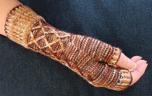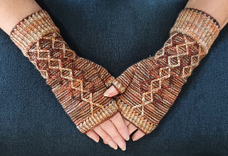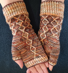 Oribus is the Latin word for trellis and these fingerless mitts have a criss-crossing trellis pattern worked in slipped stitches and simple cables with only one colour used per round.