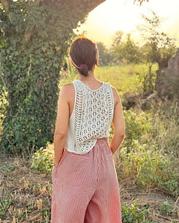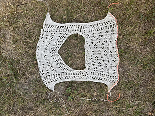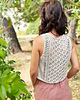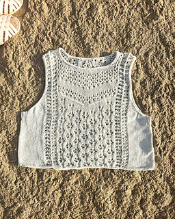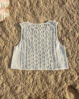 The top starts at the back. It is knitted starting at the back of the neck and working down to the armholes. The stitches are then picked up to knit the front from the top-down. Neckline is shaped while knitting lacework chart to the armholes.
