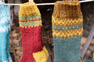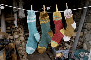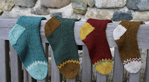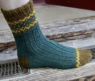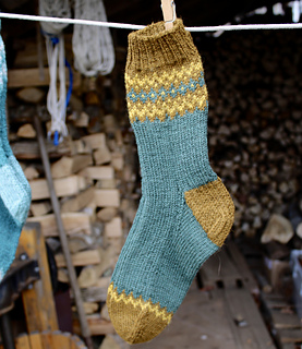 Papa (known by this name to his children and grandchildren) is a very knit-worthy man who wears wool socks almost exclusively from November through April. He spends a lot of time outdoors doing farm chores, stacking and hauling wood, hiking with the dog and x-c skiing—wool socks are a must for him here in downeast Maine! So finally, after 45 years, I made a pair just for him that includes all his favorite features—blues and greens for the colors, a wide rib that hugs the leg comfortably and doesn’t droop, a bit of colorwork for interest, a smooth wedge toe and a cushy slip-stitch patterned Dutch heel to help prevent wear.