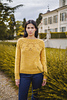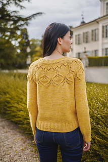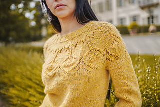 The sweater is worked in one piece without seams, proceeding in the round from the top (yoke) to the bottom (body). The sleeves are worked in the round based on the armhole openings.