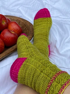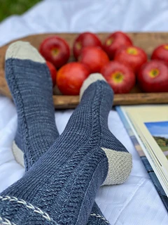 The Petoskey Sock is a cleverly written design that can produce 2 pairs (from two 100 gram skeins) by simply reversing your colors, and it also features a fabulous cuff detail! They can be customized to fit your boots by adjusting the length of the sock leg so that the generous cuff rises above your boot top. We have made sure that the cuff is wide enough to accommodate calf measurements that might require more ease, while the lower leg and foot have a more secure fit.