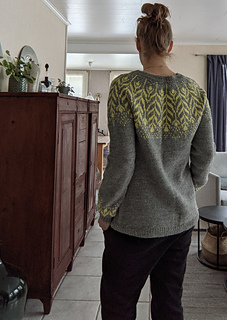 Kirjoneulekaarrokkeen jälkeen muotoillaan takakappaleen korotus saksalaisin lyhennetyin kerroksin. Samoja lyhennettyjä kerroksia käytetään myöhemmin paidan helman muotoiluun takaa hieman pidemmäksi. Paidan helmaa on levennetty sivulisäyksin.