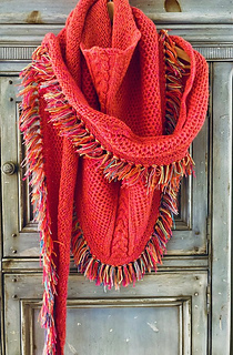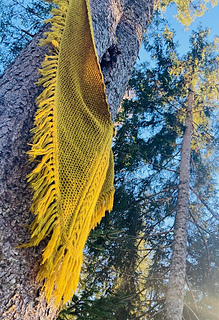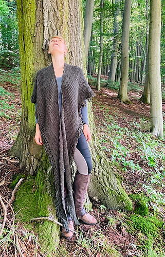 Pine Cone: Ist ein großes Dreieckstuch mit langen Seitenteilen und wird von der Mitte nach unten gestrickt. Die Mitte wird durch einen Zopf betont und die Seitenteile werden in Kreuzpatent gestrickt, das an einen Tannenzapfen erinnert und dem Schal viel Struktur gibt.