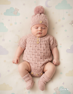 This sweet modern 3-piece Romper design features a textured yoke and an easy eyelet pattern which is then replicated on the hat and booties. The set is knitted from the top down using straight needles and knitted back and forth. meaning very little sewing is required and fewer seams.