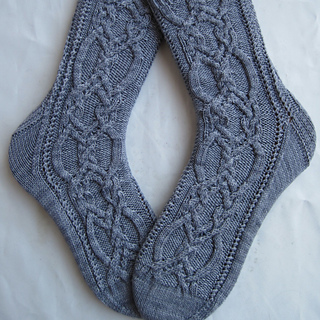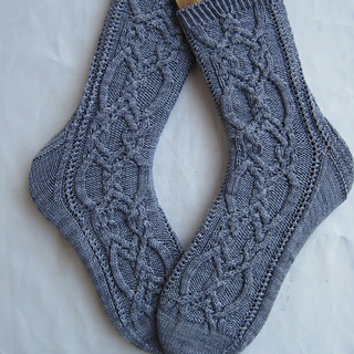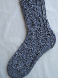 This pattern is for a pair of ornately cabled socks. The cable itself is a Canadian cable that is just perfect for socks, that comes to us from the creative mind of Annie Maloney. There’s lace fattoging in the sock for ease. The combination of the small amount of lace and ornate cable has enough “give” to make them comfortable: they will hug your ankle/leg without being too tight. The unusual cabling makes them interesting to look at and fun to knit. The back and front are the same until the heel flap.