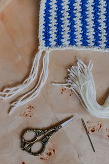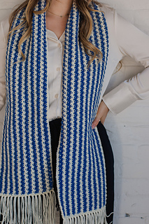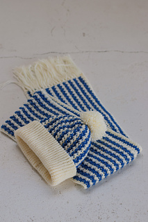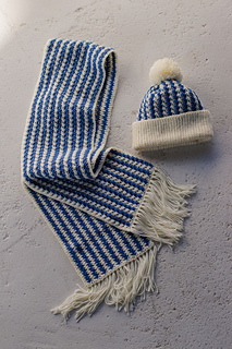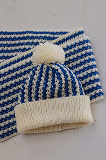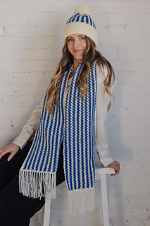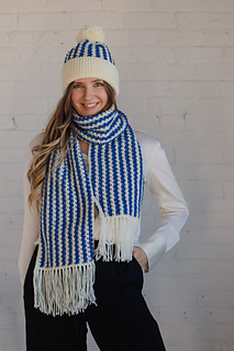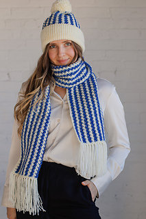 This Nordic-inspired coordinating set features a bold, high-contrast striping pattern for a timeless winter aesthetic. The hat has a fold-over brim and playful pom, while the scarf is finished with fringe. This is a beginner-friendly pattern using only simple stitches and basic shapes.