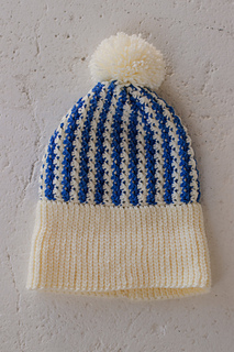 The hat is worked flat in two pieces: the ribbing and the body. These pieces are seamed together and cinched at the top before adding a pompom.