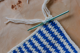 Changing Colors: You will change colors every 2 rows. When changing colors, work the last stitch of the row with the old color, but do not work the final yarn-over to close the stitch. Work this yarn-over with the new color. Then drop the old color (leave it there to pick up when you begin the next stripe in that color) and continue crocheting with the new color.