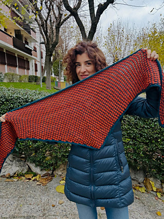 A shawl in a highly textured popcorn pattern resembling bobbles, worked with two colors of fingering weight yarn. This stitch pattern combines two rows worked with three strands and two rows with a single strand and their alternation creates this textured fabric. Three strands are prepared from one skein, so you don’t need to have three different skeins to knit with yarn held triple.
